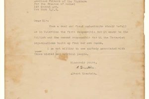 ” Yang terhormat, Ketika bencana nyata dan terakhir menimpa kita di Palestina, pihak pertama yang bertanggung jawab adalah Inggris, dan pihak kedua adalah organisasi teroris yang dibangun dari pihak kita sendiri. Saya tidak ingin melihat siapa pun dikaitkan dengan orang-orang yang menyesatkan dan kriminal itu.” Hormat kami, Albert Einstein.